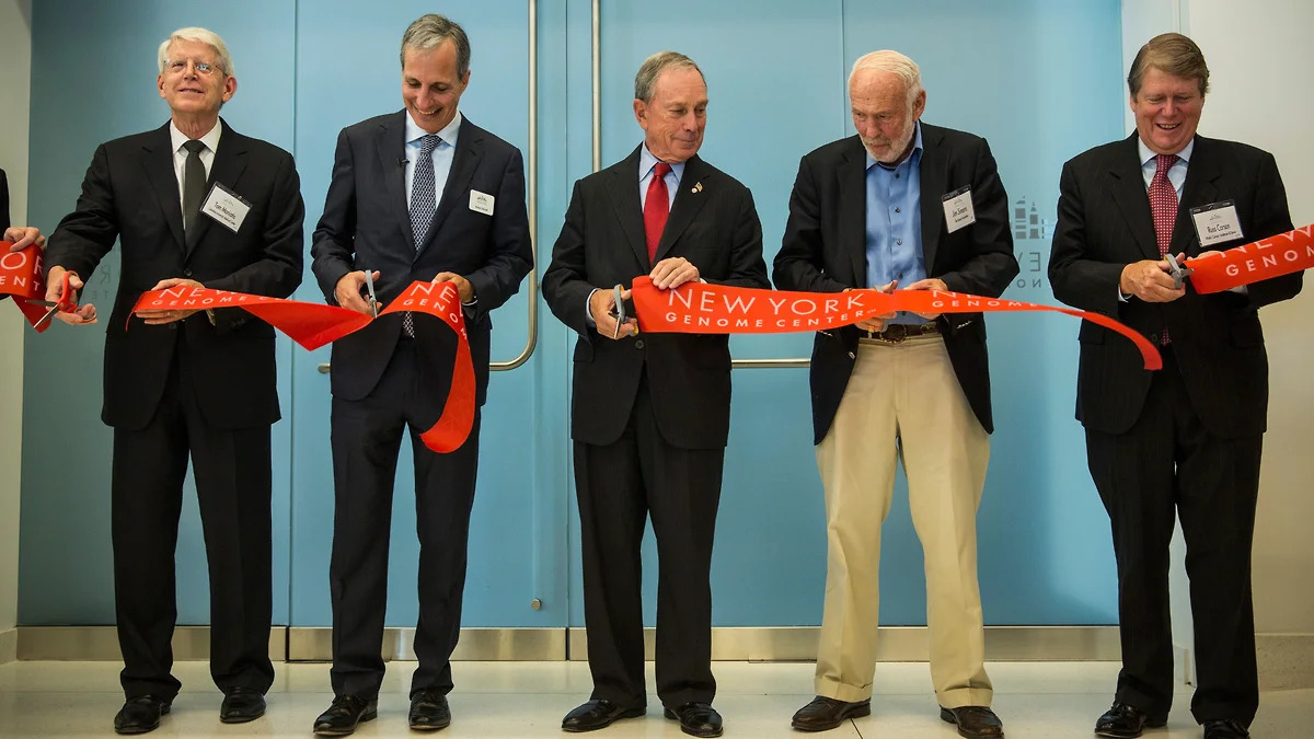 Церемония открытия Нью-Йоркского центра изучения генома в 2013 году. Саймонс (на фото второй справа) — один из главных спонсоров центра. В прошлом году он пожертвовал центру $100 млн на новые исследования в течение пяти лет